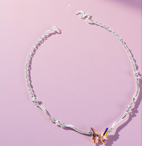 ✨ Iridescent Butterfly Crystal Necklace – Silver Tone Elegance
